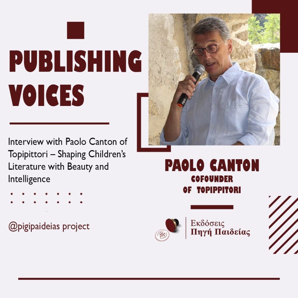 When Topipittori was founded in Italy in 2004 by Paolo Canton and Giovanna Zoboli, the vision was clear yet ambitious: children’s books could be poetic, visually striking, and intellectually engaging all at once. Nearly two decades later, the independent publisher has become a reference point in Italian and European children’s literature, known for titles that respect the intelligence of young readers while offering beauty, innovation, and imagination. In this interview with Pigi Paideias editor Evangelia Tziaka, co-founder Paolo Canton reflects on the milestones that have shaped Topipittori, from nurturing new illustrators and authors to maintaining a distinctive visual and literary identity. He discusses the challenges and joys of independent publishing, the importance of international collaboration, and shares his hopes for connecting with creators and readers worldwide, including in Greece, highlighting the universal power of children’s literature to inspire curiosity, empathy, and wonder.