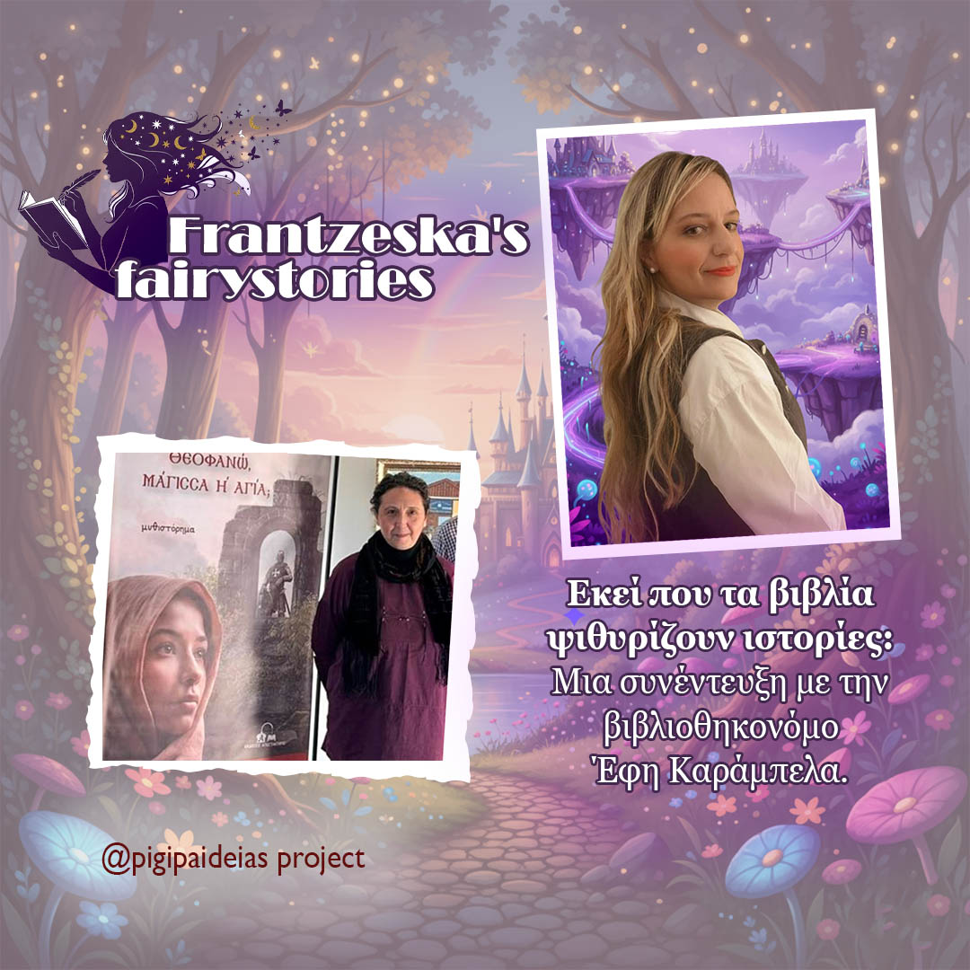 Η συζήτησή μας με την Έφη Καράμπελα αναδεικνύει τον σημαντικό ρόλο που μπορεί να διαδραματίσει μια δημοτική βιβλιοθήκη όταν λειτουργεί με μεράκι, συνέπεια και αγάπη για τον πολιτισμό. Οι δράσεις, οι παρουσιάσεις βιβλίων και οι πρωτοβουλίες της Δημοτικής Βιβλιοθήκης Καλοχωρίου αποδεικνύουν πως το βιβλίο συνεχίζει να ενώνει ανθρώπους και να δημιουργεί κοινότητες. Ευχαριστώ θερμά την Έφη Καράμπελα για τον χρόνο της  και τις σκέψεις της και εύχομαι το έργο της να συνεχίσει να εμπνέει αναγνώστες κάθε ηλικίας. Μέχρι την επόμενη ιστορία, το Frantzeska’s Fairystories θα συνεχίσει να ταξιδεύει στον μαγικό κόσμο των βιβλίων και των ανθρώπων που τα υπηρετούν.
